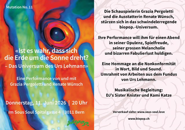 «Ist es wahr, dass sich die Erde um die Sonne dreht? – Das Universum des Urs Lehmann» – eine Performance von und mit Grazia Pergoletti und Renate Wünsch am 11. Juni 2026, 20 Uhr, im Kulturort Sous Soul, Spitalgasse 4, Bern