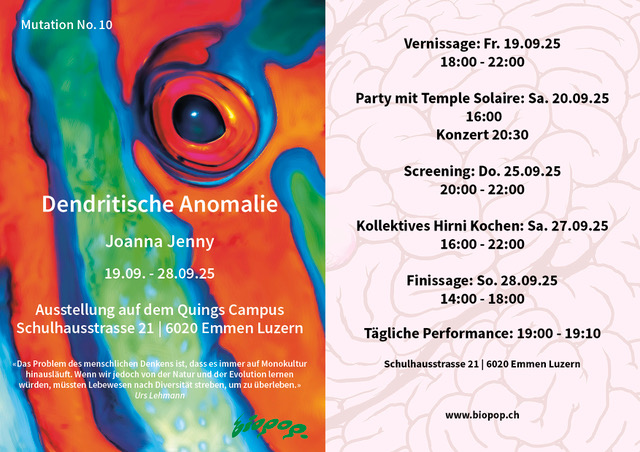 Aus dem Fundus der Arbeiten von Urs Lehmann entstehen neue Arbeiten, Zugänge, Mutationen. Vom Verein Pro biopop. eingeladene Künstler:innen erhalten neben etwas Geld Zugang zum Archiv, wählen sich daraus etwas als Vorlage, um daraus etwas Eigenes, Neues zu Erschaffen. So lebt biopop. im Sinne von Urs weiter, verändert, erneuert…